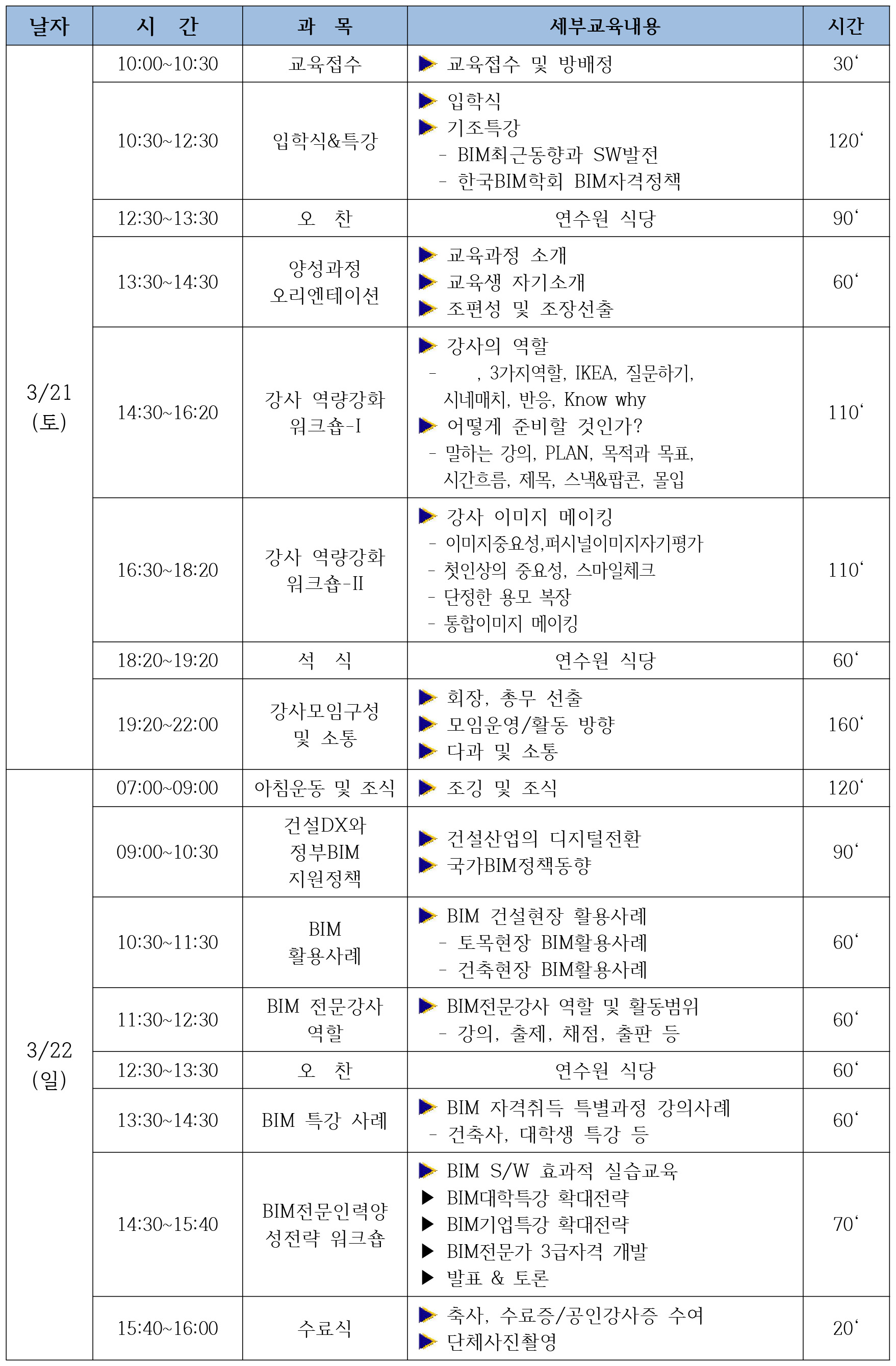 양성과정은 1박 2일간 BIM 관련 정부정책과 활용분야, 강의스킬과 이미지메이킹 등의